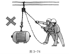 (7) 用倒链吊物时,应一人缓慢拉手链,严禁多人拉一条手链。见图3—74。